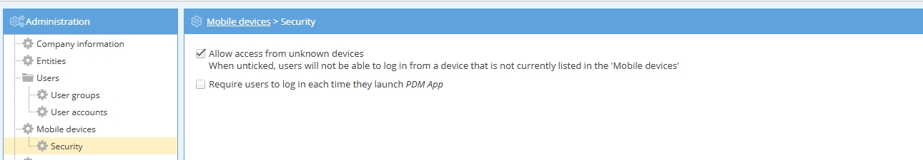 Untick this option to prevent users from logging in from a device that is not currently listed in the Mobile devices list.