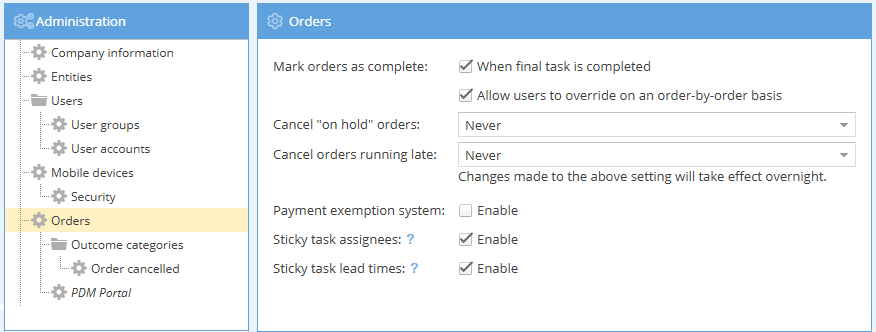 - Mark orders as complete: Set orders to be automatically marked as complete when the final task in the order is completed. You can also choose whether or not to allow users to override this option on an order-by-order basis.