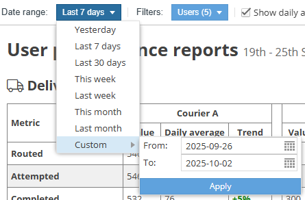 - A bar chart that compares the values of the selected metric for each user. This allows you to quickly compare performance of your delivery drivers.